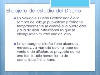 El documento describe el objeto de estudio del diseño gráfico y su método. Explica que el diseño gráfico estudia la interacción entre emisores, receptores y creadores de diseños. También describe los pasos del método del diseño que incluyen la investigación teórica, artística, científico-tecnológica e histórico-social. Además, resume el método de resolución de problemas de Bruno Munari que consta de 9 pasos como definir el problema, analizar datos, experimentar y verificar soluciones.