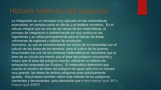 El documento describe el método del trapecio para aproximar integrales definidas. El método del trapecio aproxima el área bajo una curva como el área de un trapecio formado por la función en los límites del intervalo y una línea recta entre ellos. Se provee un ejemplo numérico para ilustrar cómo aplicar la fórmula del método.