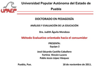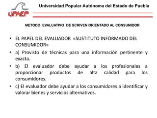 Este documento describe el método evaluativo de Scriven orientado al consumidor. Scriven propuso que los evaluadores deben actuar como sustitutos informados de los consumidores para ayudar a los profesionales a mejorar la calidad de sus productos y servicios y para ayudar a los consumidores a identificar y valorar opciones. El método implica identificar y ordenar programas y productos disponibles para los consumidores de manera independiente.