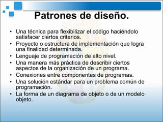 El patrón Factory Method define una interfaz para crear objetos pero deja que las subclases decidan qué clase instanciar. Esto permite flexibilizar el código al permitir que las subclases decidan qué objetos concretos crear. El patrón consiste en un creador que declara un método de fabricación para crear objetos genéricos, y subclases del creador que redefinen este método para devolver instancias de objetos concretos.