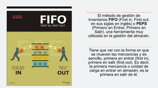 El método FIFO (First in, First out) es una herramienta de gestión de inventarios que establece que los primeros productos que entran al almacén son los primeros que salen. El objetivo de FIFO es lograr una excelente rotación de existencias al dar prioridad a la salida de los productos más antiguos. Las ventajas de FIFO incluyen una perfecta rotación de productos, priorizando la salida de los más antiguos o próximos a caducar para evitar su pérdida de valor.