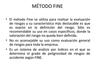 El método FINE se utiliza para realizar la evaluación de riesgos y definir el riesgo de forma exacta, siendo recomendable solo para casos específicos. No es aconsejable usarlo como evaluación general de riesgos de toda la empresa. Determina el grado de peligrosidad de riesgos de accidente según índices FINE, justificando medidas correctoras en función de su coste y grado de corrección.