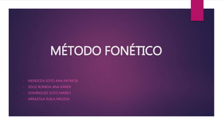El documento describe el método fonético para la enseñanza de la lectoescritura. Se atribuye su creación a Blas Pascal y Juan Amos Comenio en los siglos XVII y XVIII. El método enfatiza la pronunciación de las vocales y consonantes para facilitar la lectura. Se usan láminas y cuentos didácticos para enseñar los sonidos de las letras de forma lúdica.