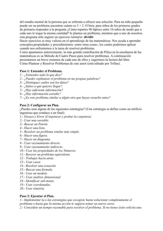 George Pólya, matemático húngaro nacido en 1887, desarrolló un método de cuatro pasos para la solución de problemas matemáticos que involucra entender el problema, configurar un plan, ejecutar el plan y mirar hacia atrás. Este método se ha convertido en una herramienta fundamental para la enseñanza de las matemáticas. Pólya también propuso varias estrategias y diez mandamientos para los profesores de matemáticas.