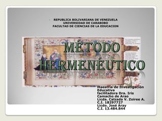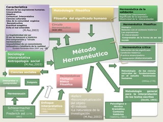 Este documento presenta una discusión sobre la hermenéutica como metodología para la interpretación de expresiones humanas. Explica que la hermenéutica es el estudio de las expresiones humanas de manera interpretativa, objetiva y contextual. Además, menciona diferentes enfoques hermenéuticos como la hermenéutica filosófica, crítica, filológica y psicológica. Finalmente, resalta que la metodología hermenéutica es útil para la interpretación de textos escritos de manera general.