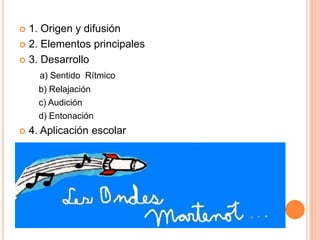 El Método Martenot se centra en la educación activa del solfeo a través de cuatro elementos principales: sentido rítmico, relajación, audición y entonación. El método utiliza juegos, ejercicios psicofísicos y la alternancia entre actividad y relajación para desarrollar la musicalidad de forma progresiva desde una edad temprana. Aunque no se difundió ampliamente, el método es valorado en Francia por su énfasis en la relajación y desarrollo holístico de la personalidad del alumno.