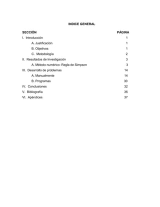 Este documento presenta un estudio sobre el método numérico de la regla de Simpson. Brevemente describe que el objetivo es investigar este método para integrar funciones definidas tabular o gráficamente y aplicarlo a problemas comunes en ingeniería. Explica que la regla de Simpson usa polinomios de grado superior para aproximar la función, resultando en una integración más precisa que otros métodos. Luego desarrolla las reglas de Simpson 1/3 y 3/8, incluyendo sus fórmulas y errores asociados. Finalmente presenta ej