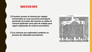 El método de shrinkage stoping implica la extracción de mineral mediante tajadas horizontales en forma ascendente, utilizando el mineral triturado como piso de trabajo. Este proceso requiere condiciones específicas de diseño y se aplica principalmente a vetas angostas, con ventajas como alta recuperación y baja dilución, pero con desventajas de dificultad en mecanización y riesgo de atranque. Es esencial mantener un ambiente adecuado para la ventilación y fortificación durante las etapas de vaciado y extracción para evitar accidentes y pérdidas de mineral.