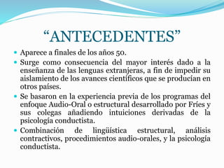 Este documento describe el método audiolingüístico para la enseñanza de idiomas, el cual se basa en la lingüística estructural y la psicología conductista. El método enfatiza el aprendizaje oral a través de la repetición y la práctica de diálogos, y asigna un papel central al profesor para modelar y corregir la lengua. El objetivo es que los estudiantes dominen la lengua de manera nativa a través de la interacción verbal en el aula.
