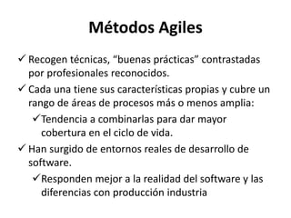 El documento describe varios métodos ágiles para el desarrollo de software. Estos métodos se basan en principios como satisfacer al cliente mediante entregas frecuentes de software, dar la bienvenida a los cambios, y construir proyectos en torno a equipos motivados. Algunos métodos ágiles destacados son Extreme Programming (XP), la familia Crystal, Adaptive Software Development (ASD), y SCRUM.
