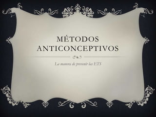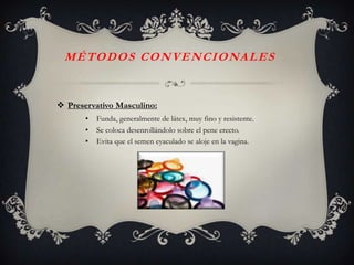 Este documento describe varios métodos anticonceptivos convencionales como preservativos masculinos y femeninos, diafragmas y dispositivos intrauterinos. También describe métodos químicos y hormonales como la píldora anticonceptiva, inyecciones hormonales, implantes hormonales y espermicidas. Finalmente, menciona métodos quirúrgicos como la vasectomía y la ligadura de trompas, e identifica algunos métodos como inútiles para la anticoncepción.