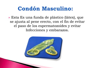 Este documento describe diferentes métodos anticonceptivos como preservativos, diafragmas, dispositivos intrauterinos, pastillas anticonceptivas y abstinencia periódica. También menciona que el uso del condón no solo previene el embarazo sino también las infecciones de transmisión sexual como VIH/SIDA.