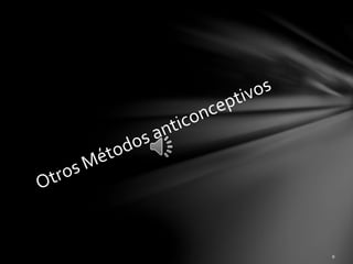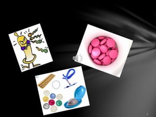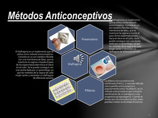 El documento presenta información sobre diferentes métodos anticonceptivos, incluyendo el diafragma, las píldoras, el DIU, la ligadura de trompas, el parche, el calendario, la temperatura basal, la lactancia y el coito interrumpido. Describe qué son, cómo funcionan y su efectividad para prevenir el embarazo.