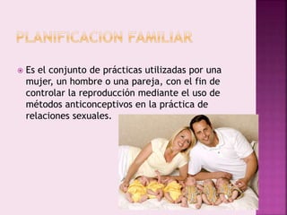 La planificación familiar incluye métodos para controlar la reproducción y se adapta a las necesidades de cada pareja, considerando factores como la frecuencia de relaciones sexuales y la eficacia de cada método. Existen métodos anticonceptivos naturales, de barrera, hormonales, químicos y quirúrgicos, cada uno con distintas tasas de efectividad y requisitos de uso. La elección del método adecuado implica evaluar la comodidad, efectos secundarios y situación económica del usuario.