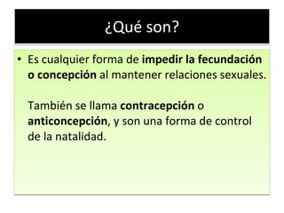 Existen varios tipos de métodos anticonceptivos, incluyendo métodos de barrera como preservativos y diafragmas, métodos hormonales como pastillas anticonceptivas y parches, métodos intrauterinos como DIUs, métodos naturales como abstinencia periódica y métodos de seguimiento de la fertilidad, métodos permanentes como la ligadura de trompas y la vasectomía, y métodos de emergencia como la píldora del día siguiente. Cada método funciona de manera diferente para prevenir el embarazo al bloquear la ov