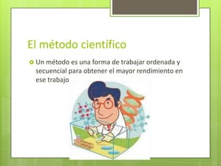 El documento describe los pasos del método científico, incluyendo la observación de un hecho, la búsqueda de datos, la formulación de una hipótesis, la experimentación, y la elaboración de leyes, teorías o conclusiones. Explica que la observación es notar sucesos que llaman nuestra atención, la hipótesis es una suposición que puede ser cierta o falsa, y la experimentación es lo que se planea para verificar si la hipótesis es correcta.