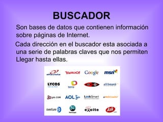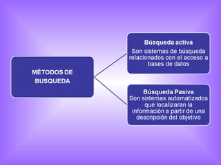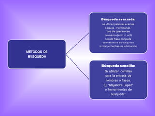 Este documento describe diferentes métodos de búsqueda de información en Internet como buscadores, motores de búsqueda y operadores lógicos. Explica que los buscadores contienen información sobre páginas web asociada a palabras clave y que los motores de búsqueda pueden ser temáticos o metabuscadores que buscan en otros motores. También cubre el uso de operadores lógicos como "+", "OR", "-" y "(" ")".