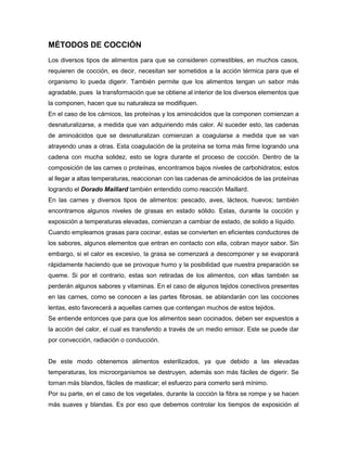 El documento describe diferentes métodos de cocción de alimentos. Estos incluyen la cocción por convección, conducción y radiación, así como métodos de cocción seca como el horneado, a la parrilla y gratinado, y métodos húmedos como hervir, blanquear y cocinar al vapor. El documento explica cómo cada método afecta la textura y sabor de los alimentos.