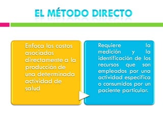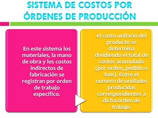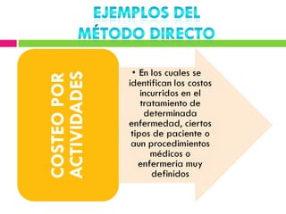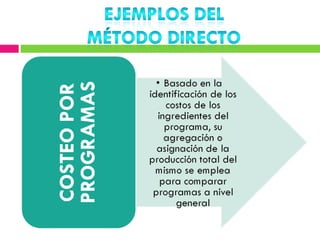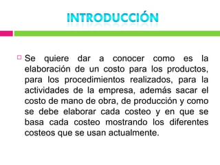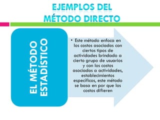 Este documento describe diferentes métodos de cálculo de costos como el costeo variable, de absorción y ABC. Explica conceptos como costos fijos, variables, directos e indirectos y cómo se distribuyen en cada método. El objetivo es determinar con precisión el costo de producción para tomar mejores decisiones sobre precios, inventarios y rentabilidad.