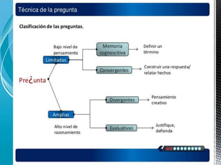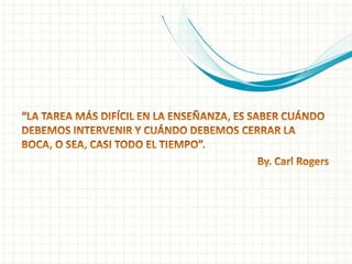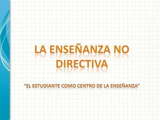 El documento describe las ideas de Carl Rogers sobre la enseñanza no directiva. Según Rogers, las relaciones humanas auténticas son fundamentales para el desarrollo personal, por lo que la enseñanza debería centrarse en las relaciones entre personas en lugar de los contenidos académicos. El papel del docente es ser un facilitador que guíe el aprendizaje y desarrollo del estudiante de manera no directiva. Este enfoque permite que los estudiantes exploren libremente nuevas ideas a través de la reflexión guiada por el docente.