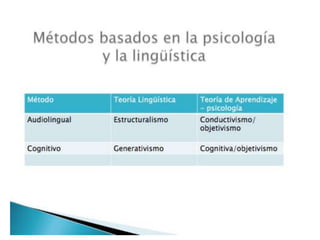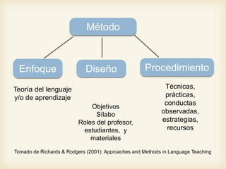 Este documento describe los diferentes métodos de enseñanza de lenguas, incluyendo sus enfoques teóricos, diseños, procedimientos, objetivos y roles de profesores y estudiantes. Define términos clave como enfoque, método y técnicas. Además, resume brevemente la historia de los métodos desde los siglos 17-19 hasta los métodos más modernos y explica por qué es útil estudiar los diferentes métodos.