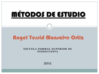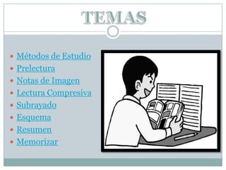 Este documento describe varios métodos de estudio como la prelectura, notas al margen, lectura comprensiva, subrayado, esquema, resumen y memorización. La prelectura implica una primera vista general del tema para obtener una idea general. Las notas al margen capturan las ideas principales en palabras clave. La lectura comprensiva involucra una lectura detallada con búsqueda de significados desconocidos. El subrayado resalta las palabras más importantes. El esquema sintetiza la lección una vez aprendida. El resumen extra