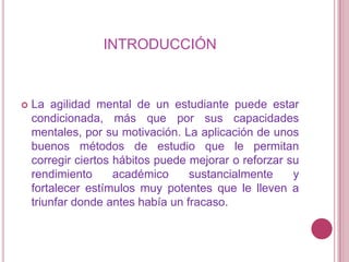 Este documento describe varios métodos y técnicas de estudio importantes como la prelectura, notas al margen, lectura comprensiva, subrayado, esquema, resumen y memorización. También discute problemas comunes como el entorno inadecuado, miedo, agobio, ansiedad y materias difíciles. Finalmente, proporciona varias fuentes bibliográficas sobre métodos de estudio.