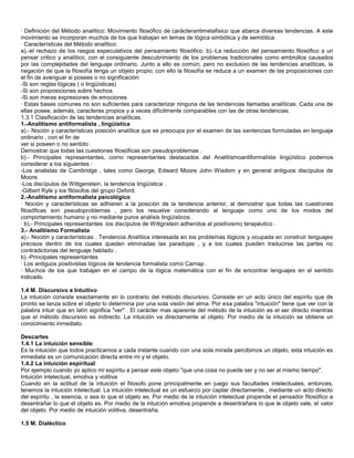 1. Este documento describe diferentes métodos filosóficos como el método mayéutico de Sócrates, los métodos inductivo y deductivo, el método analógico, el método discursivo e intuitivo, y el método dialéctico de Hegel. 2. Explica que el método mayéutico de Sócrates consistía en ayudar a los discípulos a descubrir la verdad por sí mismos mediante preguntas, mientras que el método dialéctico de Hegel se refiere a la ley universal del cambio y proceso.