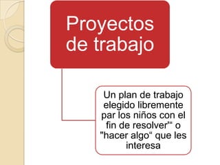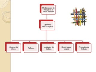 Este documento describe diferentes métodos y enfoques de enseñanza y aprendizaje en educación preescolar. Explica conceptos como situaciones didácticas, unidades didácticas y talleres. También discute los inicios y orígenes de varios métodos como el método de proyectos de Dewey, el enfoque de Decroly basado en satisfacer necesidades naturales a través del medio, y el sistema de unidades didácticas de Morrison. El documento provee referencias sobre estos temas.