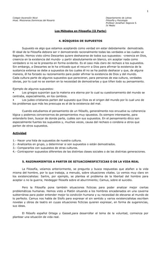 El documento resume cinco métodos utilizados en filosofía para buscar la verdad: análisis y síntesis, desarrollo y crítica de argumentos, diálogo, búsqueda de supuestos y razonamientos a partir de situaciones ficticias o de la vida real. Se proveen ejemplos como el mito de la caverna de Platón y la discusión de Descartes sobre deshacerse de supuestos.