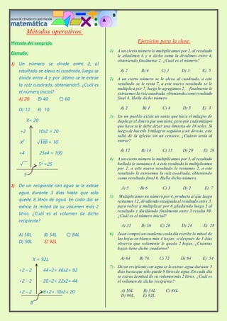 Este documento presenta varios ejemplos y ejercicios de problemas resueltos utilizando el método de la falsa suposición o regla del rombo. Este método se aplica cuando en un problema participan elementos divididos en dos grupos con valores unitarios conocidos que suman un valor total dado. El documento explica cómo ubicar la información en un diagrama de rombo para calcular el número de elementos de un grupo. Luego, proporciona una serie de ejercicios para que el lector practique este método.