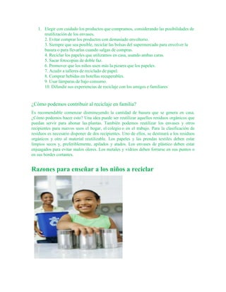 El documento habla sobre la importancia del reciclaje para proteger el medio ambiente. Explica que reciclar papel, vidrio y aluminio ayuda a ahorrar recursos como árboles, energía y agua. También destaca la importancia de enseñar a los niños sobre reciclaje desde pequeños y darles el ejemplo en casa separando la basura en diferentes contenedores.