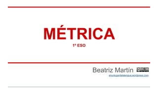 Este documento explica conceptos básicos de métrica como verso, estrofa y poema. Define la métrica como la disciplina que estudia los elementos rítmicos de los textos escritos en verso, incluyendo el número de sílabas, la rima y la combinación de los versos. Explica cómo medir los versos teniendo en cuenta la posición del acento de la última palabra y conceptos como sinalefa e hiato. Además, clasifica los versos según su número de sílabas y describe los tipos de rima y el esquema