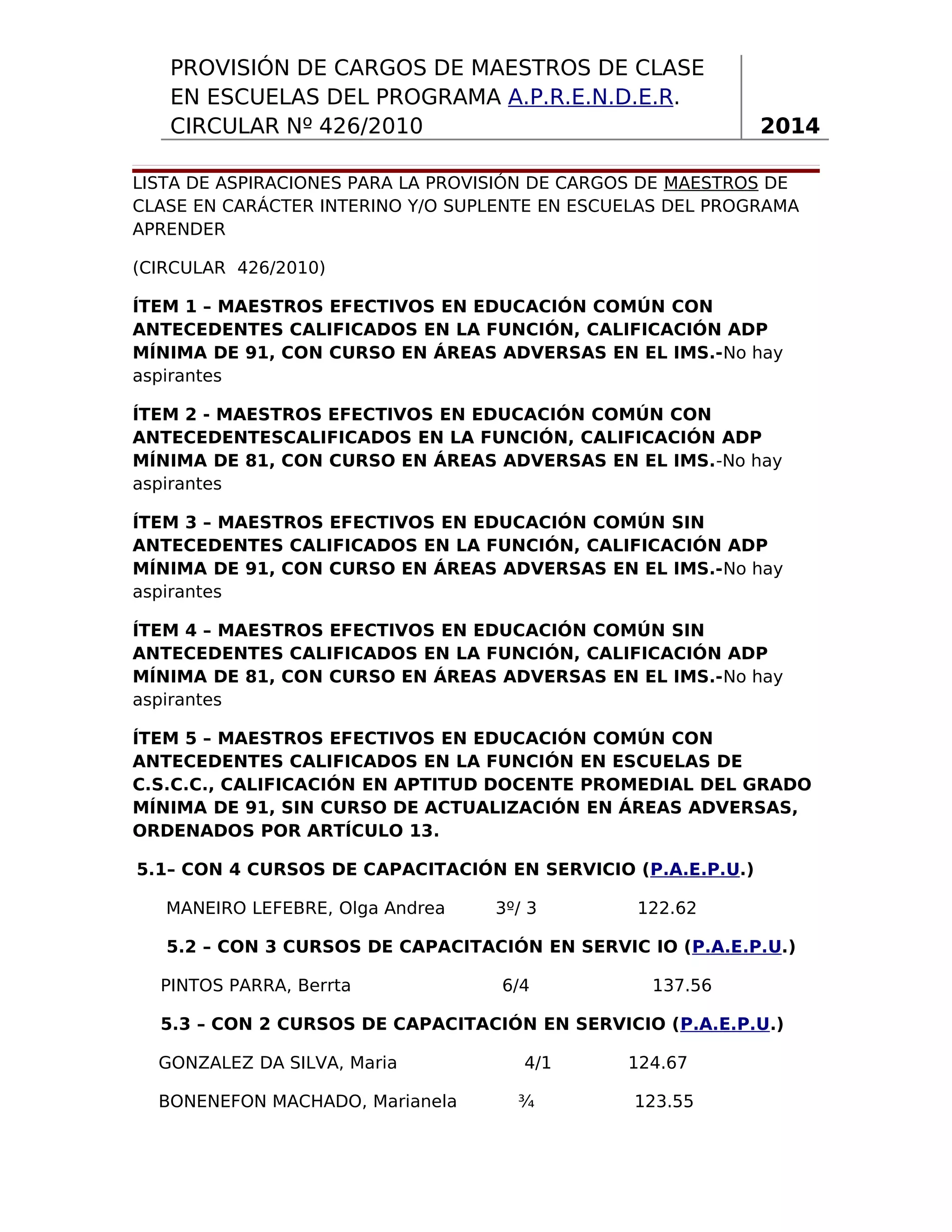 Este documento presenta una lista de aspirantes para la provisión de cargos de maestros de clase en escuelas del Programa Aprender en Uruguay. La lista incluye maestros efectivos ordenados por sus antecedentes calificados, calificación en aptitud docente, y cursos de capacitación completados. No hay aspirantes que cumplan con los requisitos más altos, pero la lista proporciona múltiples candidatos para cada ítem con diferentes niveles de antecedentes y calificaciones.