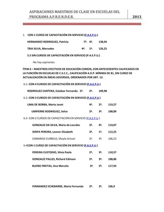 Este documento lista las aspiraciones de maestros para cargos de clase en escuelas del programa Aprender en Uruguay en 2013. Divide a los maestros en varias categorías según sus antecedentes, calificaciones y cursos de capacitación completados, e incluye el nombre y puntaje de cada maestro que aspira a dichos cargos.
