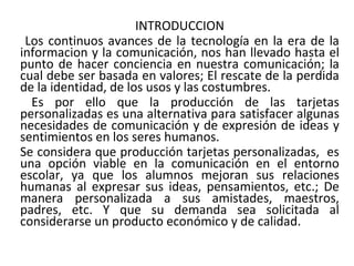 El documento propone la producción de tarjetas personalizadas en una escuela técnica para desarrollar habilidades productivas en los estudiantes. Se estima una producción de 50 tarjetas por día que generarían $1,500 semanales con una utilidad de $560. El proyecto busca capacitar a los estudiantes en herramientas digitales y acercarlos al mundo laboral.