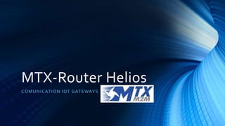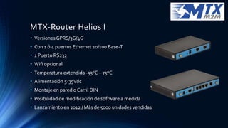 El documento describe tres modelos de routers de comunicaciones IOT fabricados por MTX: el MTX-Router Helios I, disponible en versiones GPRS/3G/4G con 1 o 4 puertos Ethernet y 1 puerto RS232, el MTX-Router Helios I actualizado con más puertos Ethernet y opciones de conectividad y el nuevo MTX-Router Helios II con conectividad 4G y más puertos y funciones. Todos los modelos operan en un rango extendido de temperaturas, se alimentan entre 5-35Vdc y se montan en pared o en car