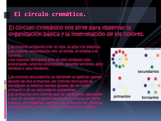 La teoría del color explica que el color es una percepción subjetiva causada por la luz. Los colores primarios son el rojo, azul y amarillo, y los secundarios son el verde, violeta y naranja. El tono se refiere al matiz de color, la brillantez a su intensidad y la saturación a su pureza. Además, los colores despiertan emociones específicas y tienen propiedades psicológicas como la calma o la estimulación.