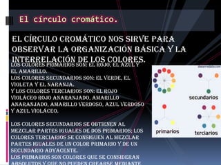Este documento explica la teoría del color. Define el color como una sensación subjetiva producida por la luz. Explica que los colores primarios son el rojo, azul y amarillo y cómo se obtienen los secundarios y terciarios. Describe los elementos del color como el tono, la brillantez y la saturación. Finalmente, analiza las respuestas emocionales que producen diferentes colores y clasifica los colores en cálidos, fríos, claros, oscuros y brillantes.