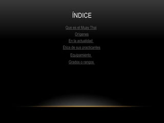 El Muay Thai es un arte marcial tailandés que combina técnicas de piernas y brazos practicado de pie. Tiene sus orígenes en Tailandia como preparación para el combate y ahora se practica como deporte. Los practicantes siguen una ética de cortesía, perseverancia y sacrificio. El equipamiento incluye protecciones para las piernas, brazos, cabeza y el mongkon y prapajeat como amuletos.
