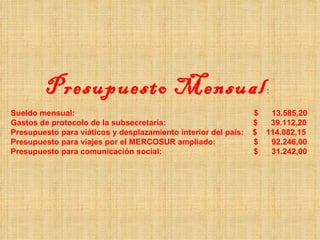 El documento detalla el presupuesto mensual de Luis Ángel D'Elía como subsecretario, que asciende a $290,267.55. Este monto incluye su sueldo de $13,585.20, $39,112.20 para gastos de protocolo, $114,082.15 para viáticos nacionales, $92,246 para viajes al MERCOSUR y $31,242 para comunicación social. Además, dispone de 3 choferes y 2 vehículos asignados. Anualmente, esto cuesta a los contribuyentes argentinos $3,483,