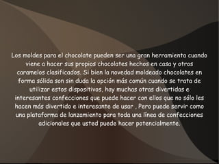 Los moldes de chocolate son herramientas versátiles para crear diversas golosinas, permitiendo fabricar chocolates rellenos, malvaviscos, caramelos y gelatinas. Se pueden personalizar los rellenos y experimentar con diferentes formas para hacer la confección más interesante. Sin embargo, se debe tener cuidado al utilizar moldes de plástico con preparaciones que requieren altas temperaturas.