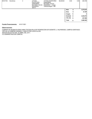 La Universidad de Valparaíso encargó la compra de muebles a AGM y DIMAD SA para equipar una sala en el Campus Santiago. La orden incluye mesas, sofás, sillas, estantes, un mueble de recepción y escritorios por un total de $2,680,565. La entrega de los productos debe realizarse antes del 24 de mayo de 2011.