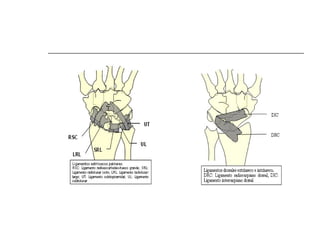 La articulación de la muñeca y la mano consta de 27 huesos agrupados en el carpo, metacarpo y falanges. El carpo contiene 8 huesos que forman dos filas y permiten el movimiento de la muñeca. La mano tiene 5 huesos metacárpicos y 14 falanges en los dedos. La muñeca y mano están inervadas por los nervios mediano y cubital y contienen músculos flexores y extensores importantes para el movimiento.