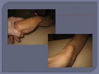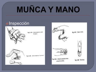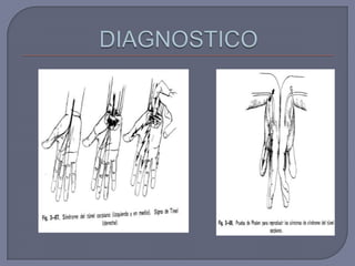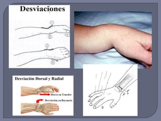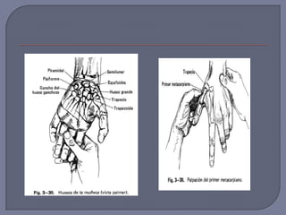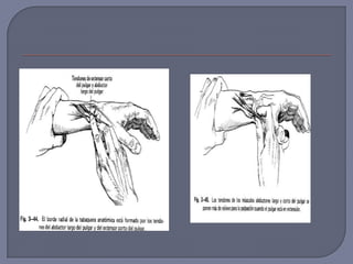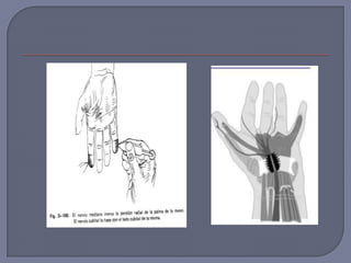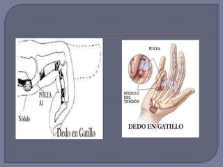 Este documento describe varias lesiones y enfermedades de la mano y muñeca. Incluye estenosis del tendón del pulgar, síndrome del túnel carpiano, fractura de la apófisis estiloides del radio, luxación de la base del primer metacarpiano y síndrome del dedo en gatillo. Se proporcionan detalles sobre los síntomas, signos clínicos, grupos de edad afectados y opciones de tratamiento para cada condición.