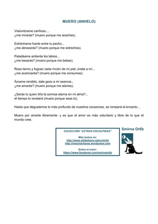 El poema expresa el anhelo de ser amado intensamente a través de gestos físicos y emocionales como miradas, abrazos, besos y caricias. El autor dice morir por ser amado libremente y de forma voluntaria, más allá de las limitaciones del mundo. Finalmente, el poema forma parte de una colección de textos escritos por Smirna Ortiz.