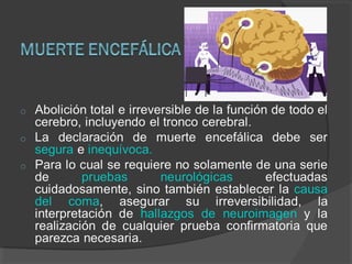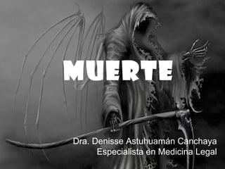 El documento habla sobre varios temas relacionados a la medicina legal y la muerte. Explica conceptos como la tanatodiagnóstico, tanatosemiología, tanatocronología y diferentes tipos de muerte como la súbita, inesperada, rápida, natural y violenta. También describe procedimientos como la autopsia, inhumación, exhumación, traslado de cadáveres y cremación.