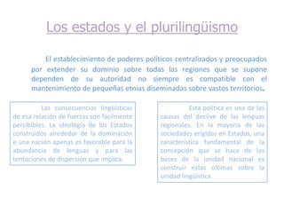 El documento describe varias causas políticas y sociales de la muerte de las lenguas minoritarias, incluyendo la creación de estados centralizados que promueven la unidad lingüística, el uso del ejército y la escuela para difundir el idioma dominante, y la influencia de los medios de comunicación masiva y el imperialismo del inglés y otros idiomas dominantes.