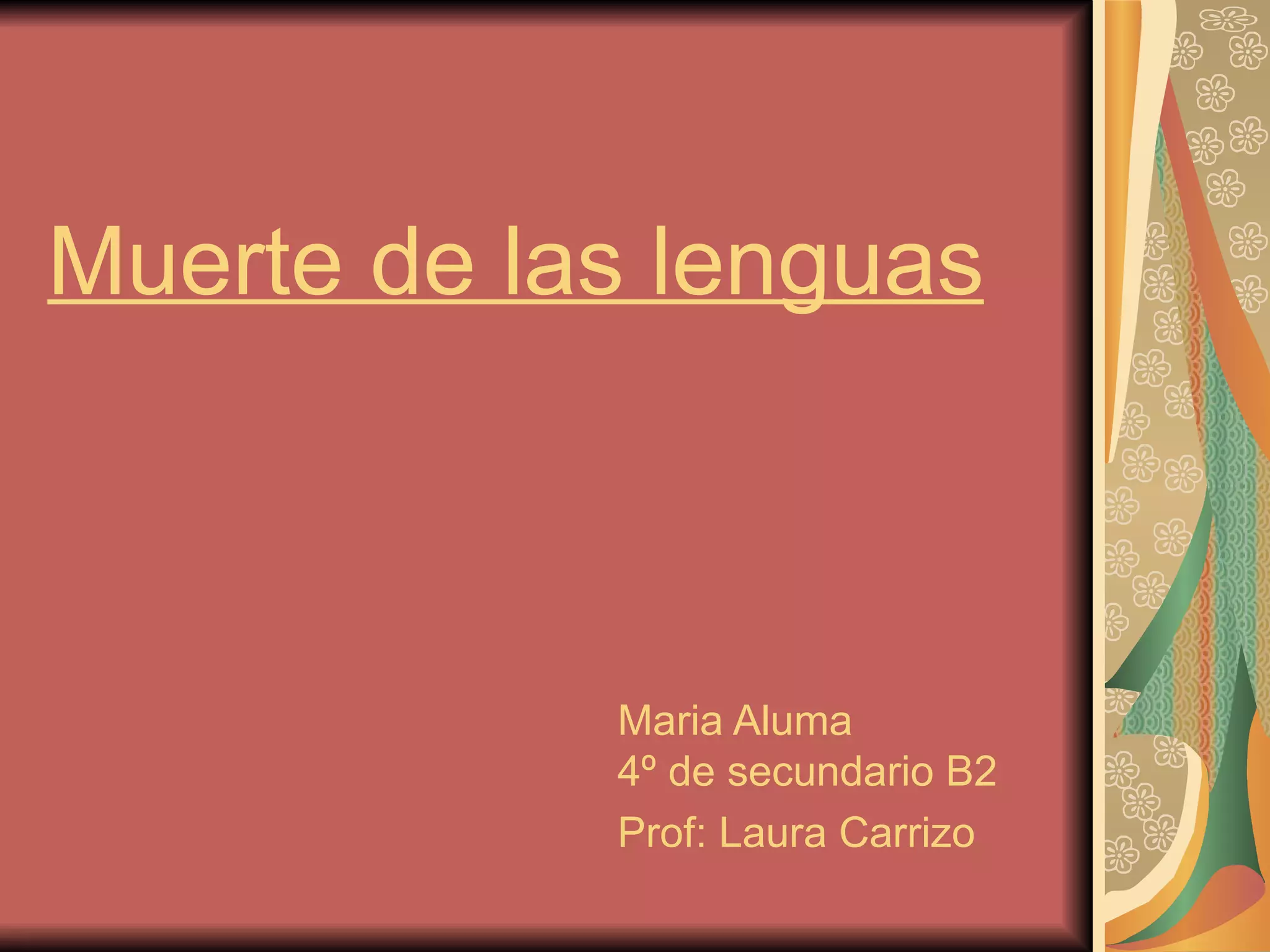 Este documento discute la muerte de las lenguas. Explica que entre 100,000 y 500,000 lenguas han existido en la historia humana, pero que hoy en día existen muy pocas debido a que la mayoría han ido desapareciendo. Las lenguas pequeñas habladas por pocos grupos tienden a desaparecer a medida que los grupos humanos se hacen más grandes e imponen sus lenguas dominantes. Las lenguas rara vez desaparecen por decisión voluntaria de sus hablantes, sino más bien debido a la presión