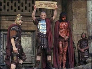El documento describe la muerte de Jesús, donde fue azotado y condenado a muerte a los 33 años. Fue sometido a un castigo extremo, crucificado con clavos en las muñecas y pies. Jesús sufrió durante más de 3 horas antes de morir desangrado, derramando 3.5 litros de sangre para salvar a la humanidad de sus pecados.